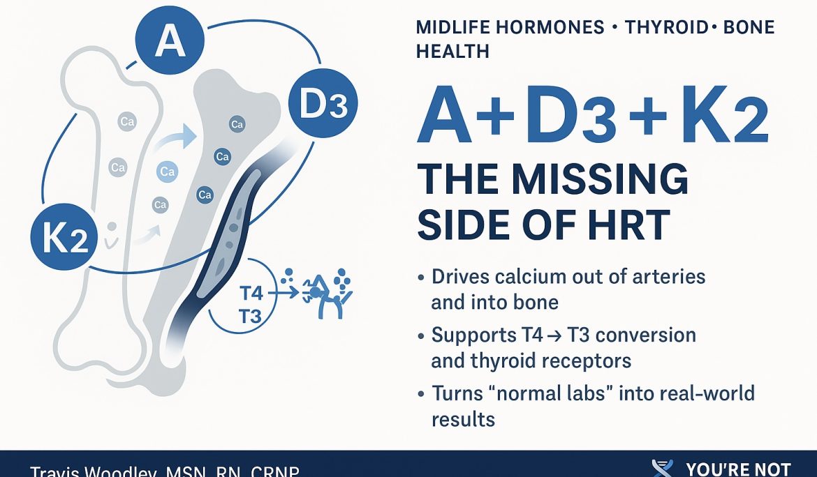 The Most Overlooked Trio in Midlife Health: Vitamin A, D3, and K2 Vitamin A, D3, and K2 are not “nice add-ons” to a supplement stack—they are the traffic controllers for calcium, thyroid conversion, and hormone receptors. When ADK is ignored, you can lift, diet, take bioidentical hormones,